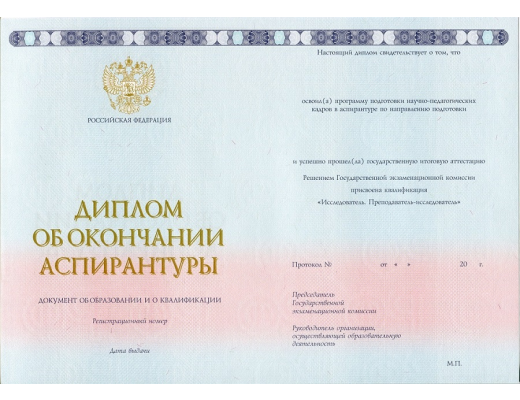 Диплом аспирантуры 2014 - 2025 гг. заполняется профессиональными специалистами по установленным правилам и нормам министерства образования РФ. Документ на 100% соответствует всем требованиями Министерства Образования и Науки РФ.