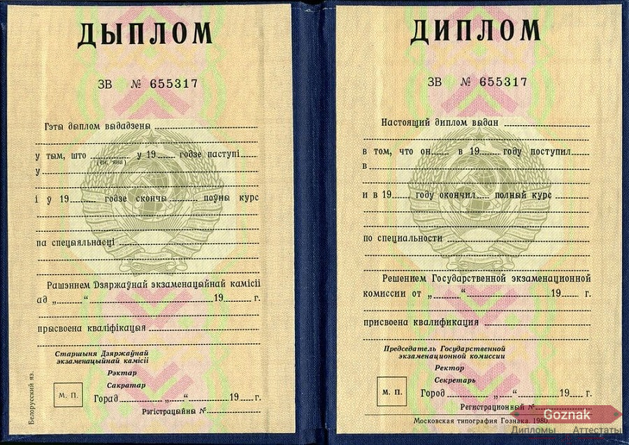 Диплом о высшем образовании Белоруссии 1970 - 1993 гг. заполняется профессиональными специалистами по установленным правилам и нормам министерства образования РФ. Документ на 100% соответствует всем требованиями Министерства Образования и Науки РФ.
